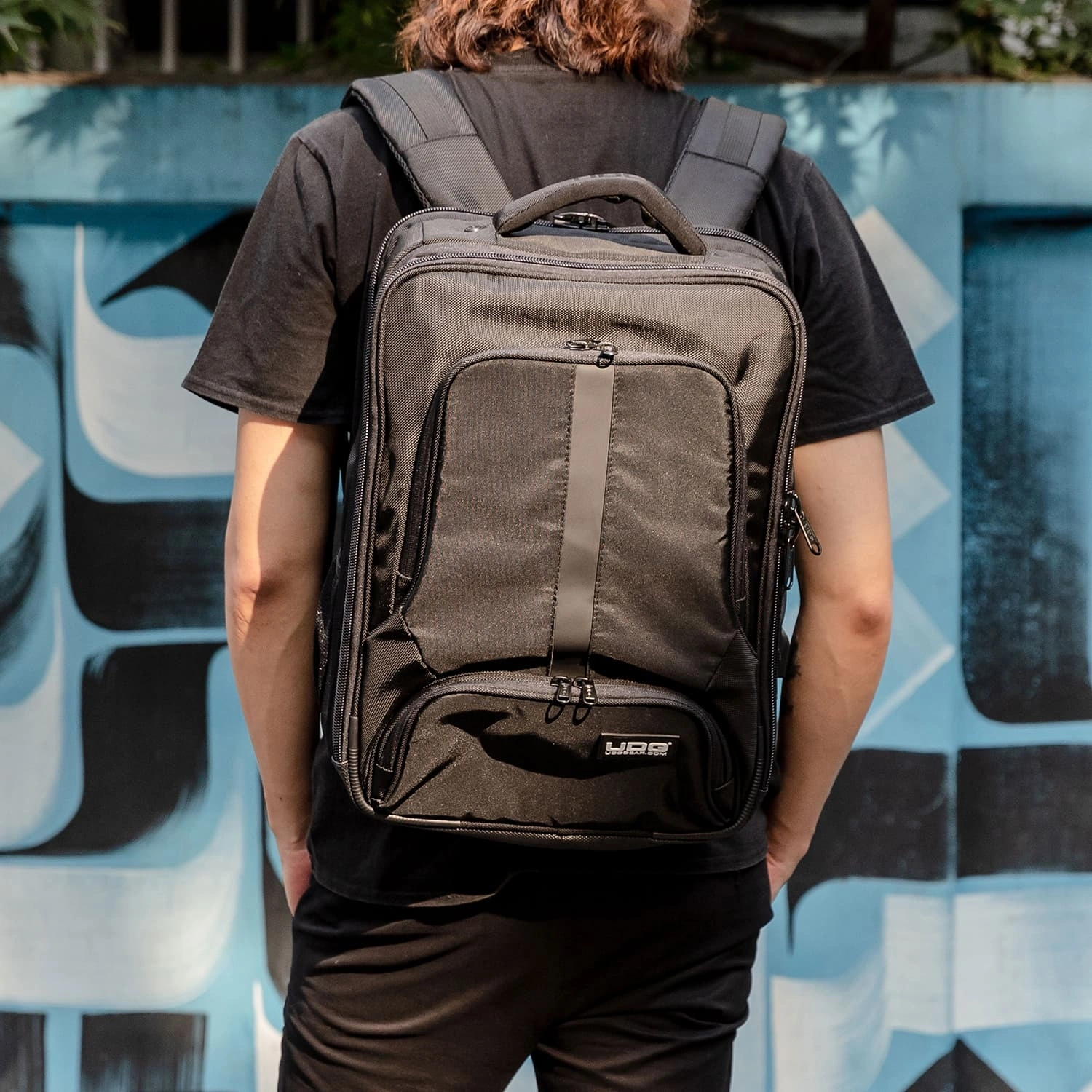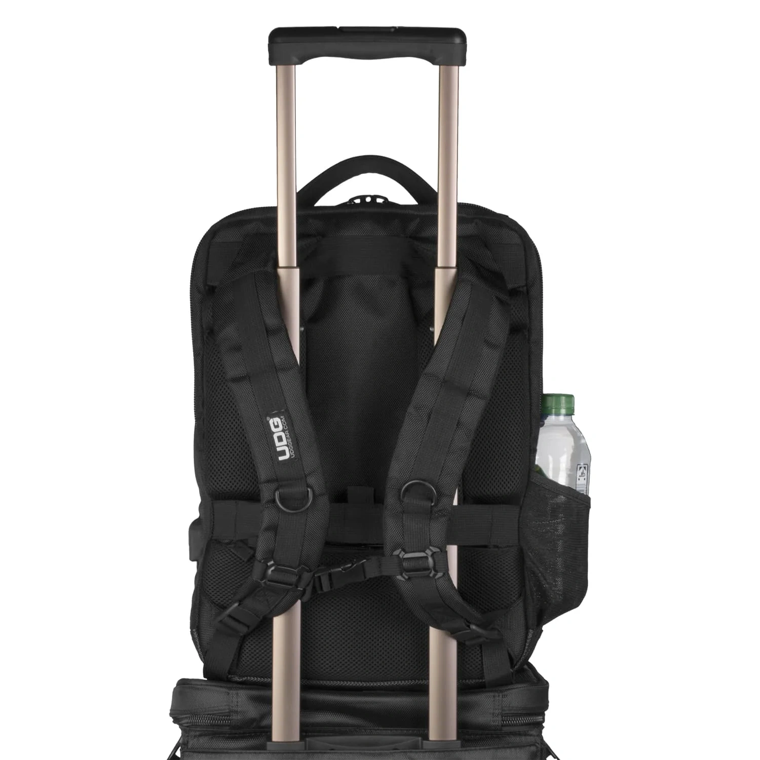 The UDG Ultimate Backpack Slim is a light weight, slim fit backpack for DJ's that require a smaller version of UDG's larger size backpacks. Constructed from high-quality water-resistant Nylon it contains a padded 17" laptop compartment with added neoprene iPad/tablet pocket. The zipper expandable main padded compartment can hold a Numark PT01 Scratch portable turntable or Pioneer DJM-S9 mixer and a few 7" & 12" tone control/ scratch vinyl and some clothing. There are enough zipped compartments to securely store microphone, USB sticks, SD cards, wires, cables and faders, AC power adapters and other accessories. This bag comes with a built-in outside USB charger connector, a quick access headphone pocket, ergonomic back padding, comfortable moisture absorbent shoulder straps and a sling so you can slide it on every UDG trolley.