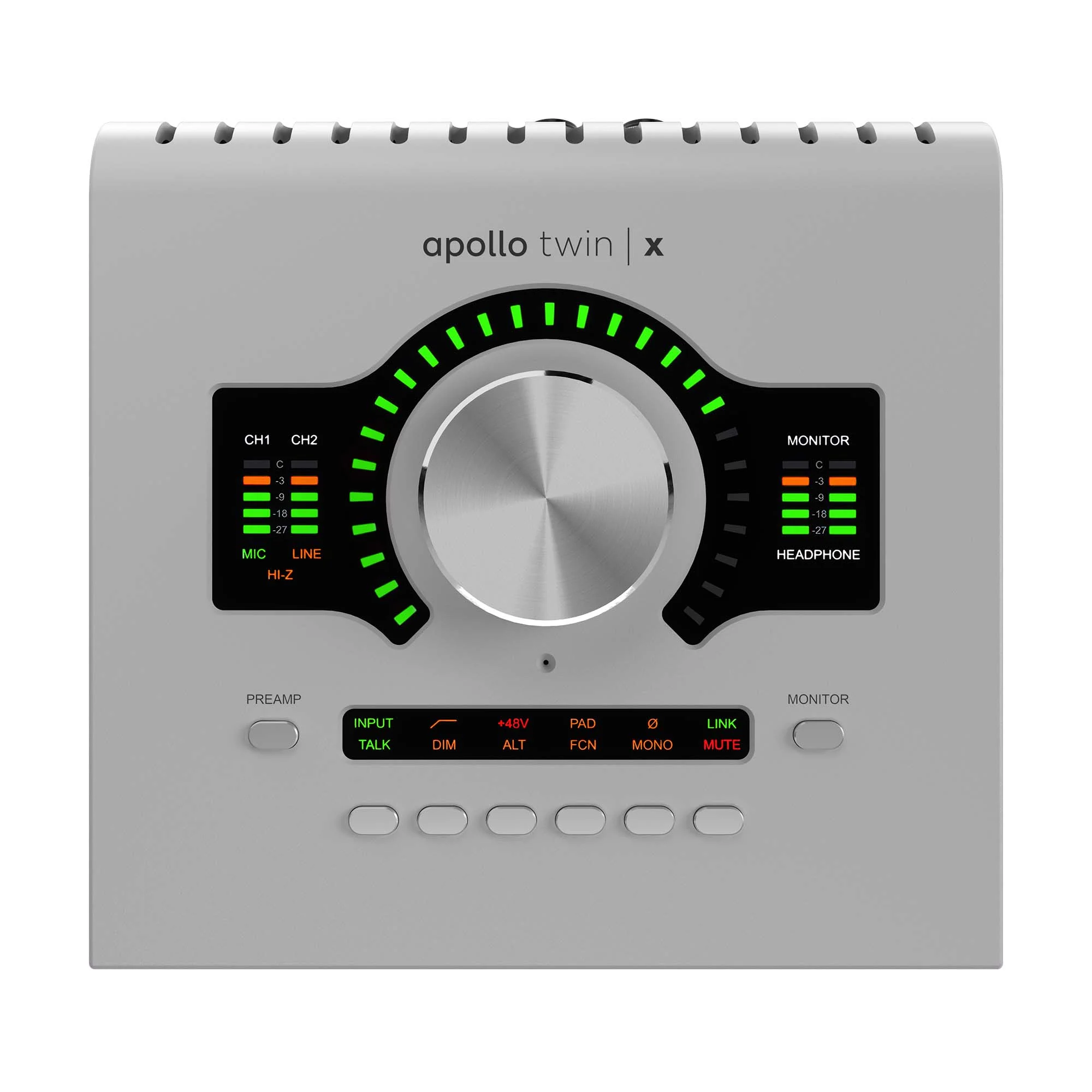 In addition to two Unison-modeled microphone preamps, Apollo Twin X offers a headphone output and Hi-Z instrument input. Additionally, with two line outputs, an optical input and ADAT/SPDIF output, an expanded monitor section, and a built-in Talkback microphone, Apollo Twin X can become the powerful center of your professional studio.