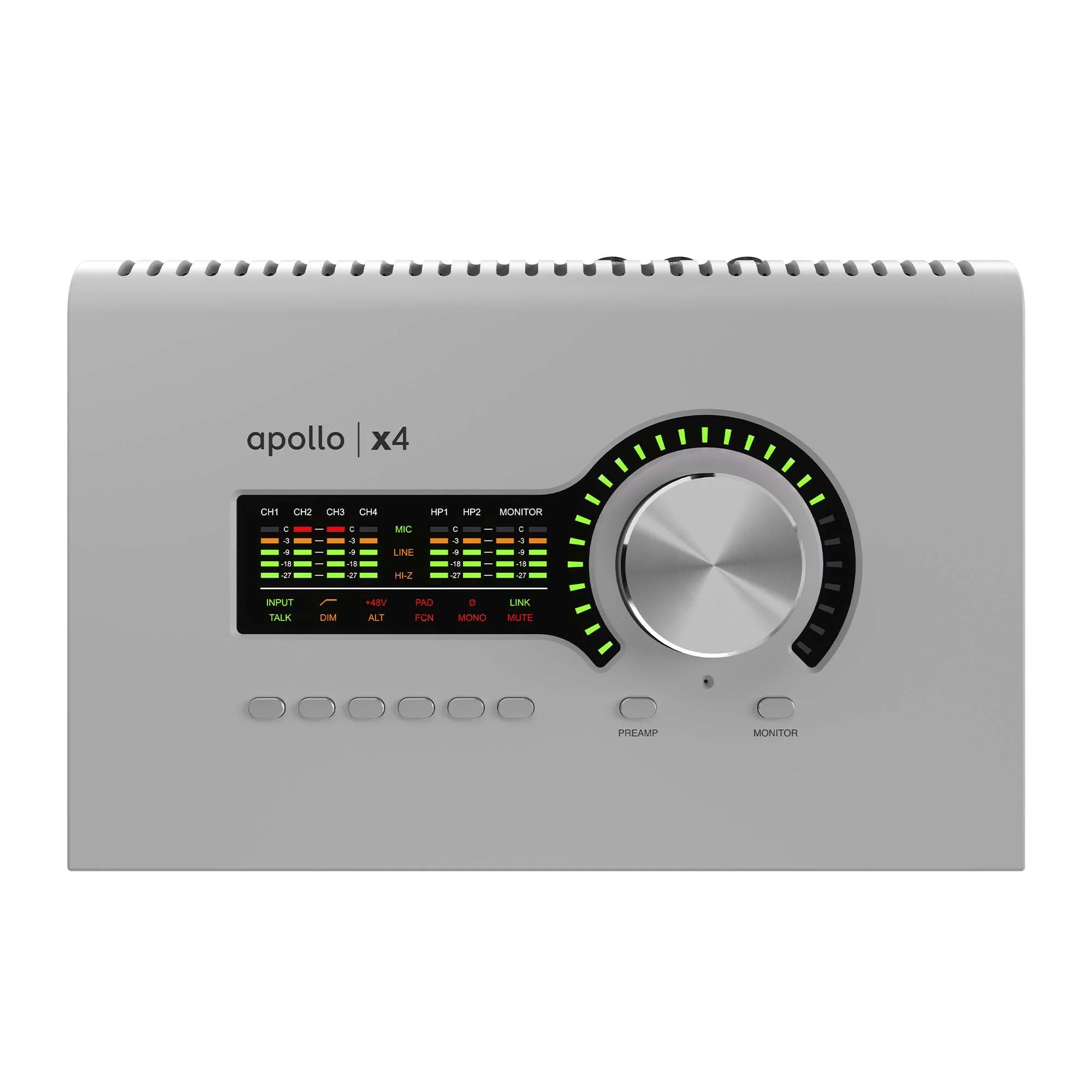 In addition to the four Unison mic preamps, Apollo x4 offers two independent headphone outputs and two Hi-Z instrument inputs, allowing you to easily record with multiple musicians. Additionally, with four line outputs, optical input and ADAT/SPDIF output, an expanded monitor section, and a built-in Talkback microphone, Apollo x4 can become a powerful center for your professional studio.