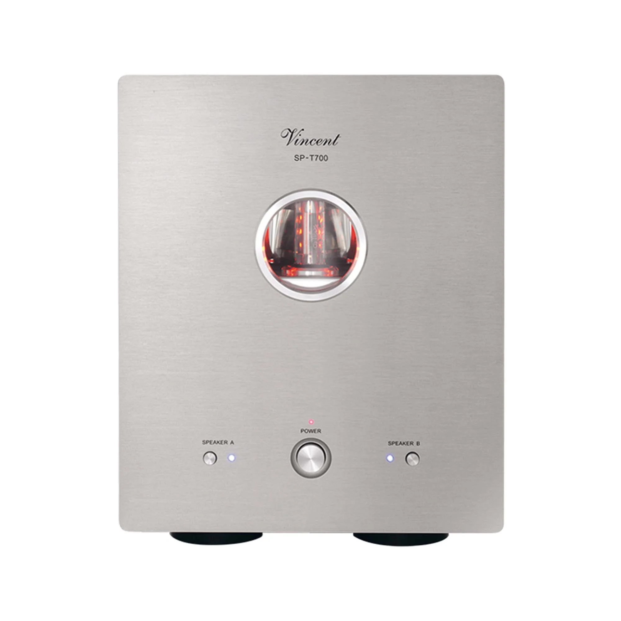 To make this power available, the SP-T700 units are equipped with a highly efficient transformer, which - together with the thick-walled casing - contributes to amplifiers of appropriate weight. One of the tubes is showcased to the listener on a "display," and to make it equally magnificent, the display window can be illuminated in three different brightness levels. The SP-T700 has two pairs of connectors, which can also be activated separately, plus two 3.5 mm mini-jack sockets labeled "Power Control" to allow remote activation via a preamplifier.