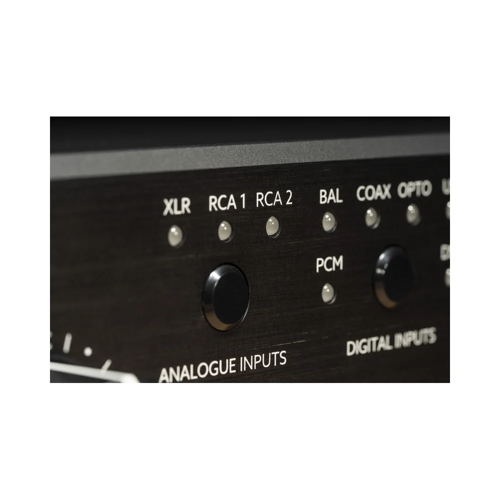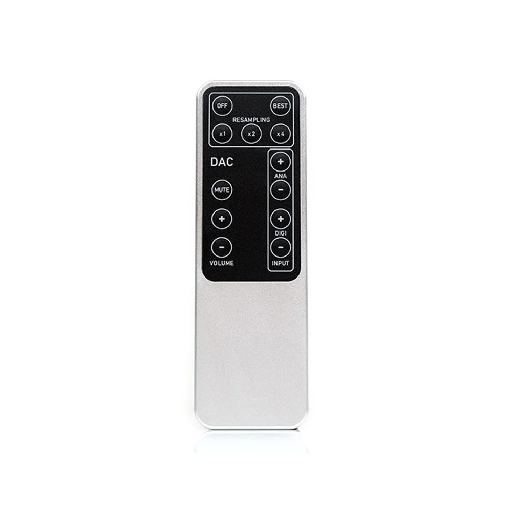 Control the device using the stylish remote control, made from a solid piece of aluminum. With the remote control, you have access to the motorized volume control, mute function, input signal selection, resampling settings, headphone control, and line output. The V590 V2 PRO version features a volume control with a 256-step relay using precision resistors.