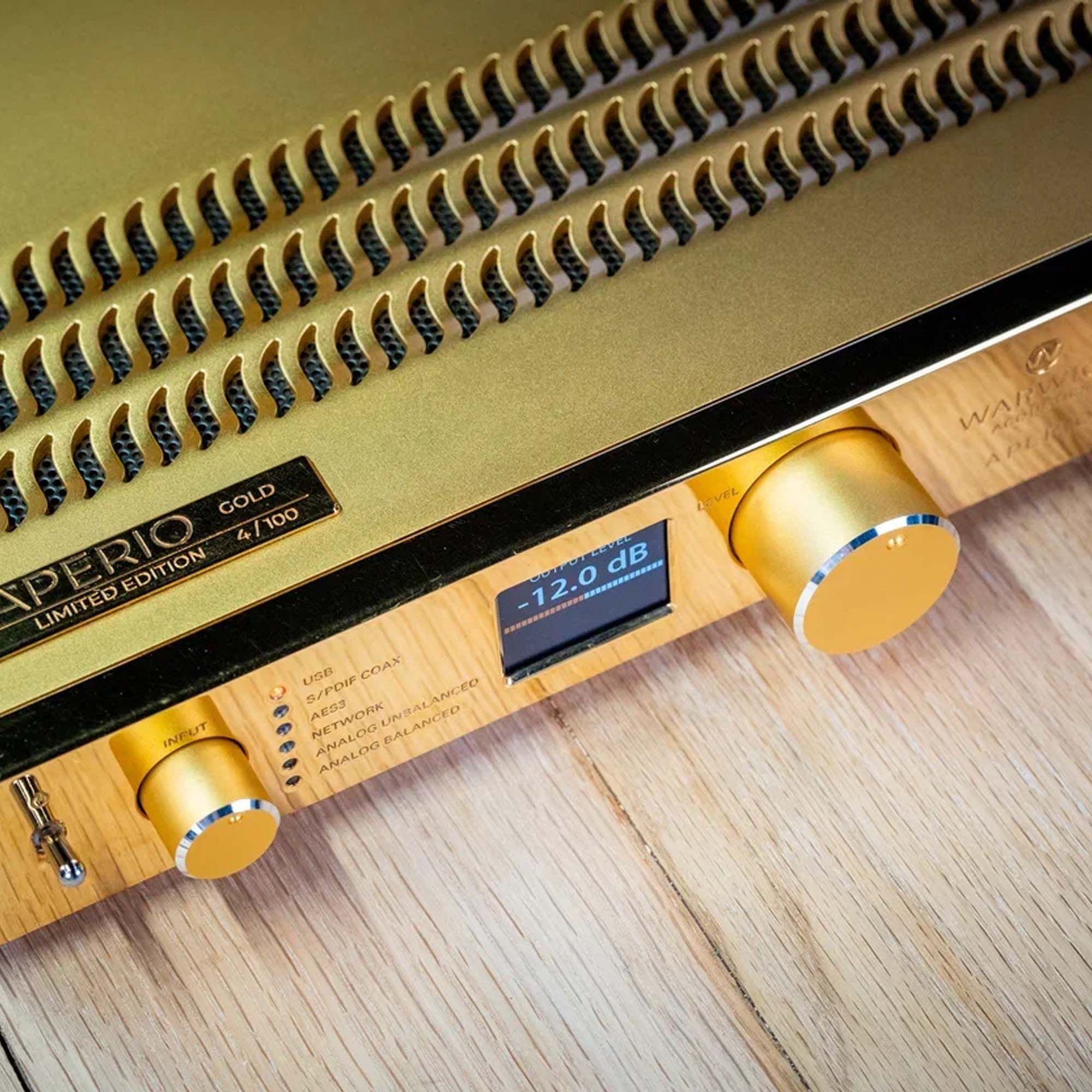 - Handcrafted 24-carat gold headphone grilles, hardware, and front panel of the amplifier