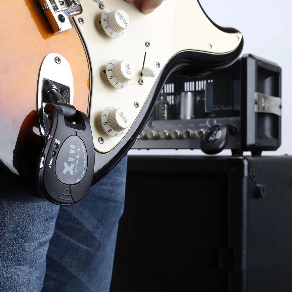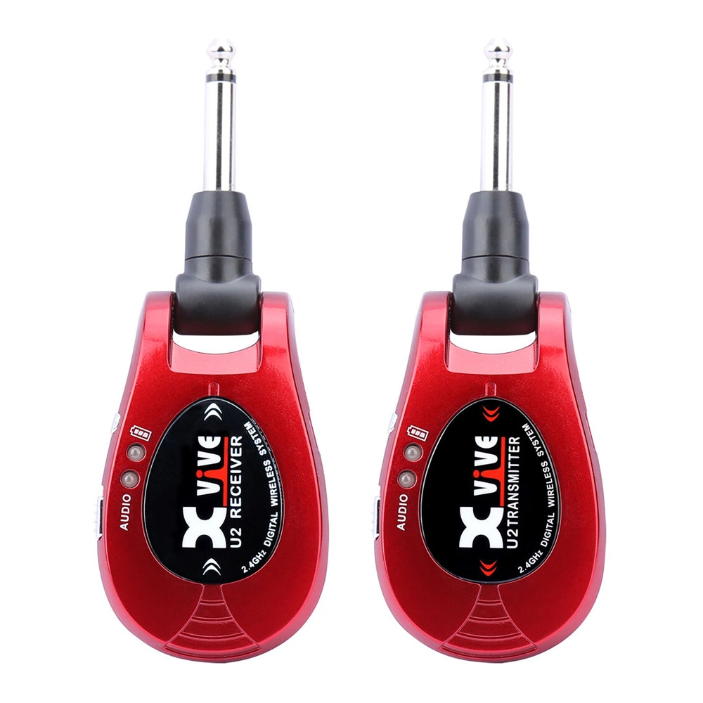 Xvive Audio U2 Digital Wireless System for Electric Guitars. If you have only experienced wireless radio transmitters for electric guitars as bulky and cost-intensive systems, you should urgently test the compact Xvive U2 Wireless System! The intuitive transmission system, consisting of a transmitter and a receiver with a transmission frequency of 2.4 GHz, fits all common guitar designs and, thanks to its wide frequency range from 20 Hz to 20 kHz, also skilfully covers the lower registers of the electric bass.