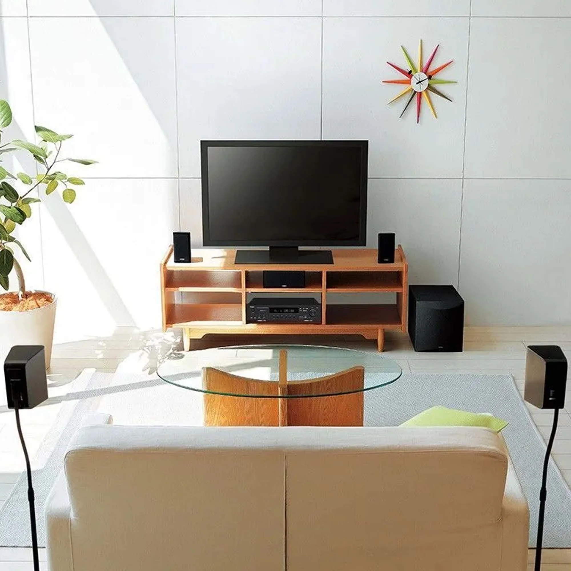 The Yamaha NS-P41 speaker set from Yamaha features a traditional enclosure design for a 5.1-channel home theater system. The subwoofer, made with Advanced YST II technology, provides strong and clear bass. Yamaha NS-P41 speakers are tuned to produce crisp, clear sound that is enjoyable to listen to for long periods of time. Whether in music or movies, the sound will be rich and expansive. The sleek black enclosures blend in well with the look of most modern flat screen TVs. Thanks to the mounting holes on the rear panel, the speakers in this set can be mounted on the wall.