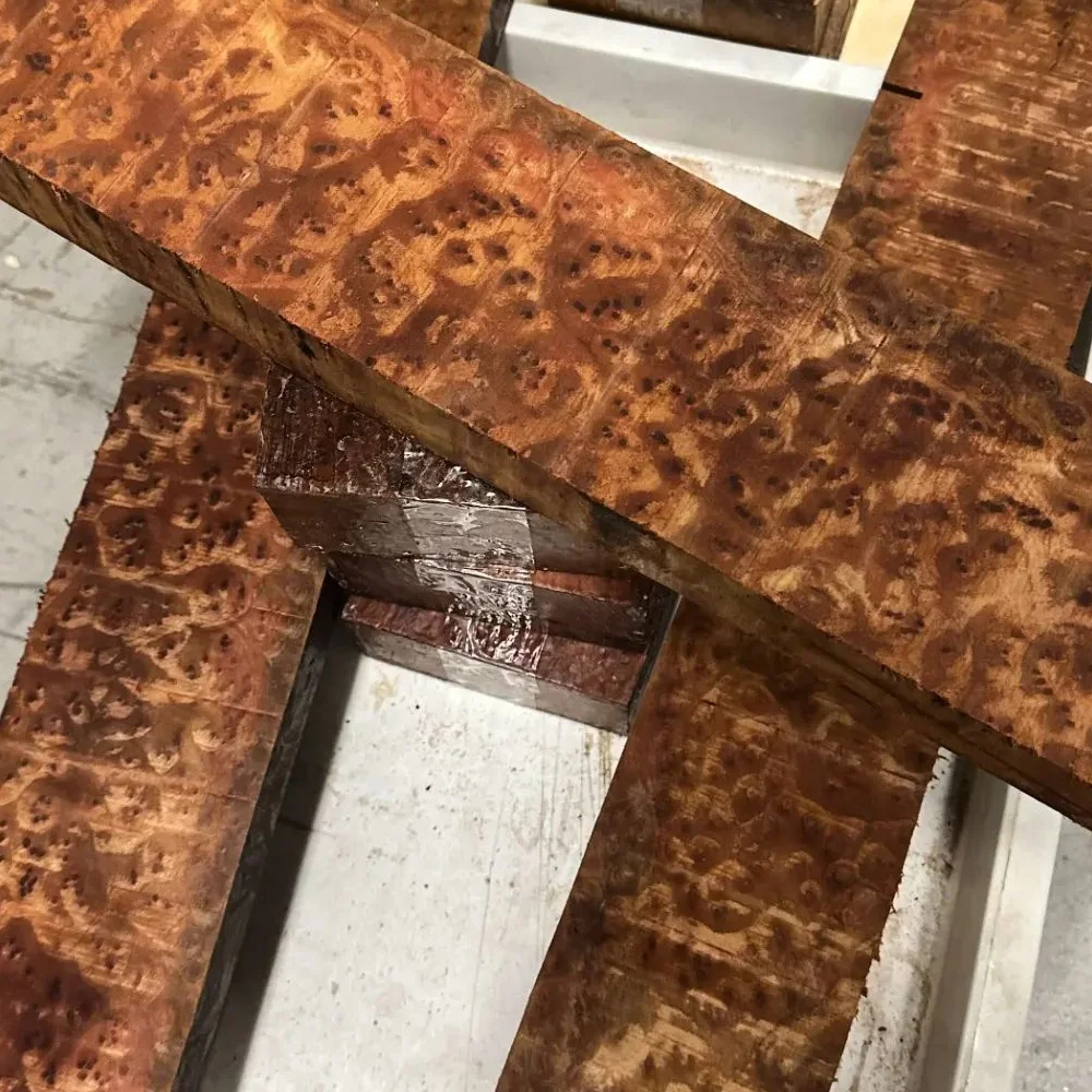 Cups are paired from the same boards to ensure close grain, texture, visual symmetry, and density. Typically, materials are taken from adjacent parts of one board, as the exotic species ZMF uses are rarely thick enough for matching.