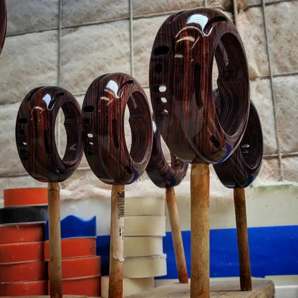 Selected blanks are then sized and machined to strict tolerances on a CNC machine. ZMF utilizes advancements in CNC (computer numerical control) and 3D printing to efficiently support small-batch manufacturing of signature wooden cups and biodegradable low-toxin plastic gaskets. Both cups are machined on a CNC machine from a single block to ensure visual symmetry and consistent density. They are then hand-sanded by a master to eliminate any remaining defects, polish, and prepare the wood for finishing.