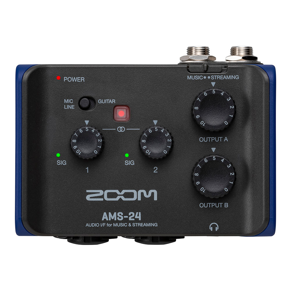 The Zoom AMS-24 is a portable 2-channel USB audio interface designed for music recording and live performance streaming. This device supports a 24-bit/96 kHz sampling frequency and is compatible with computers and mobile devices running on Windows, macOS, iOS, and Android operating systems.