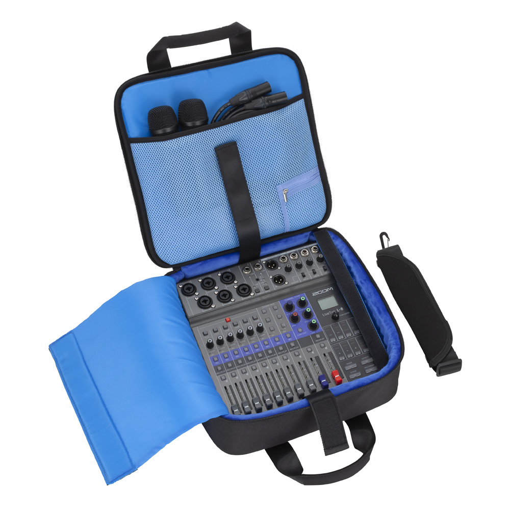The CBL-8 is a medium-density case bag made of Ethylene Vinyl Acetate (EVA). It is designed for storing and transporting the Zoom LiveTrak™ L-8 mixer and its accessories, such as the power adapter, connecting cables, and SD cards. Elastic straps securely hold the device in place, while the padding and inserts (for the L-8) protect it from bumps and shakes.