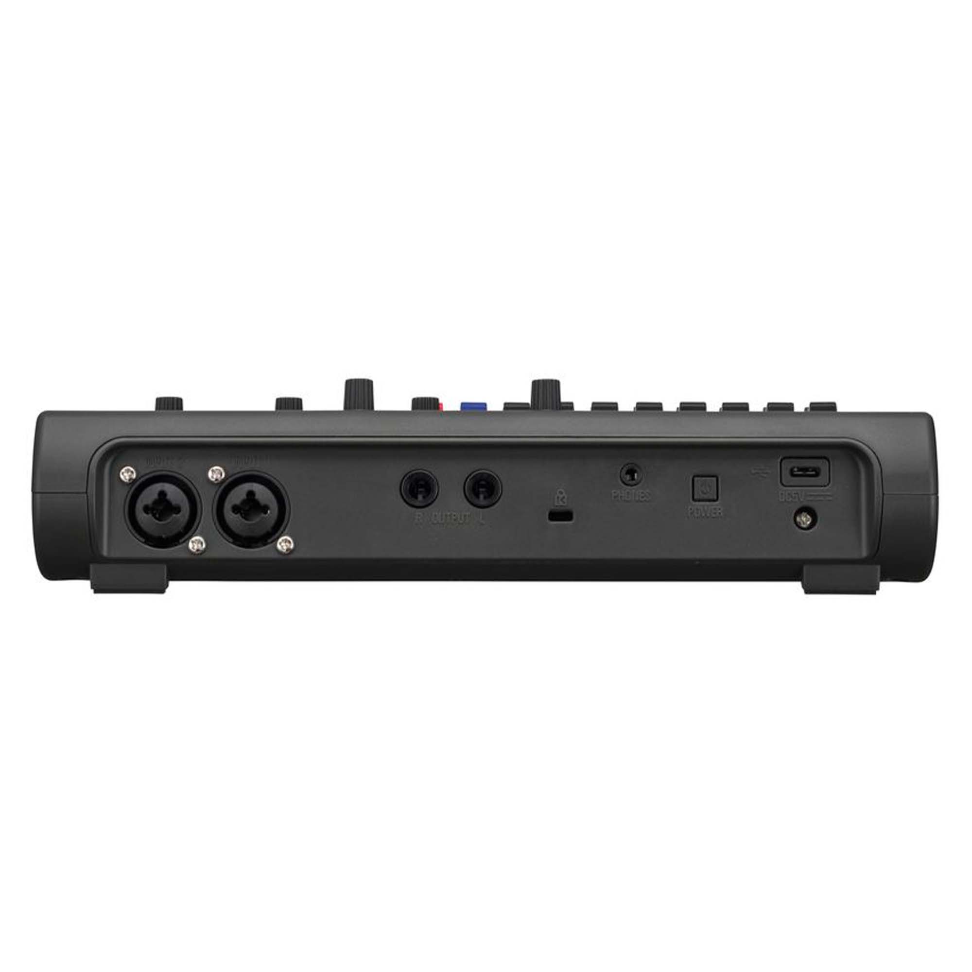 The built-in drum machine comes with 150 loops in 30 styles. The built-in synthesizer with 18 FM algorithm types and 8-voice polyphony is designed for creating melodies and pads. The synthesizer can be controlled through the touchscreen or an external keyboard connected via USB. The R12 can be powered by four AA batteries (up to 5 hours) or the AD-17 power adapter. On the rear side, there are stereo outputs and a headphone output. The USB-C port allows for using the R12 as a stereo audio interface and DAW controller, as well as for streaming. File and sample import is possible through micro SD cards or USB drives.