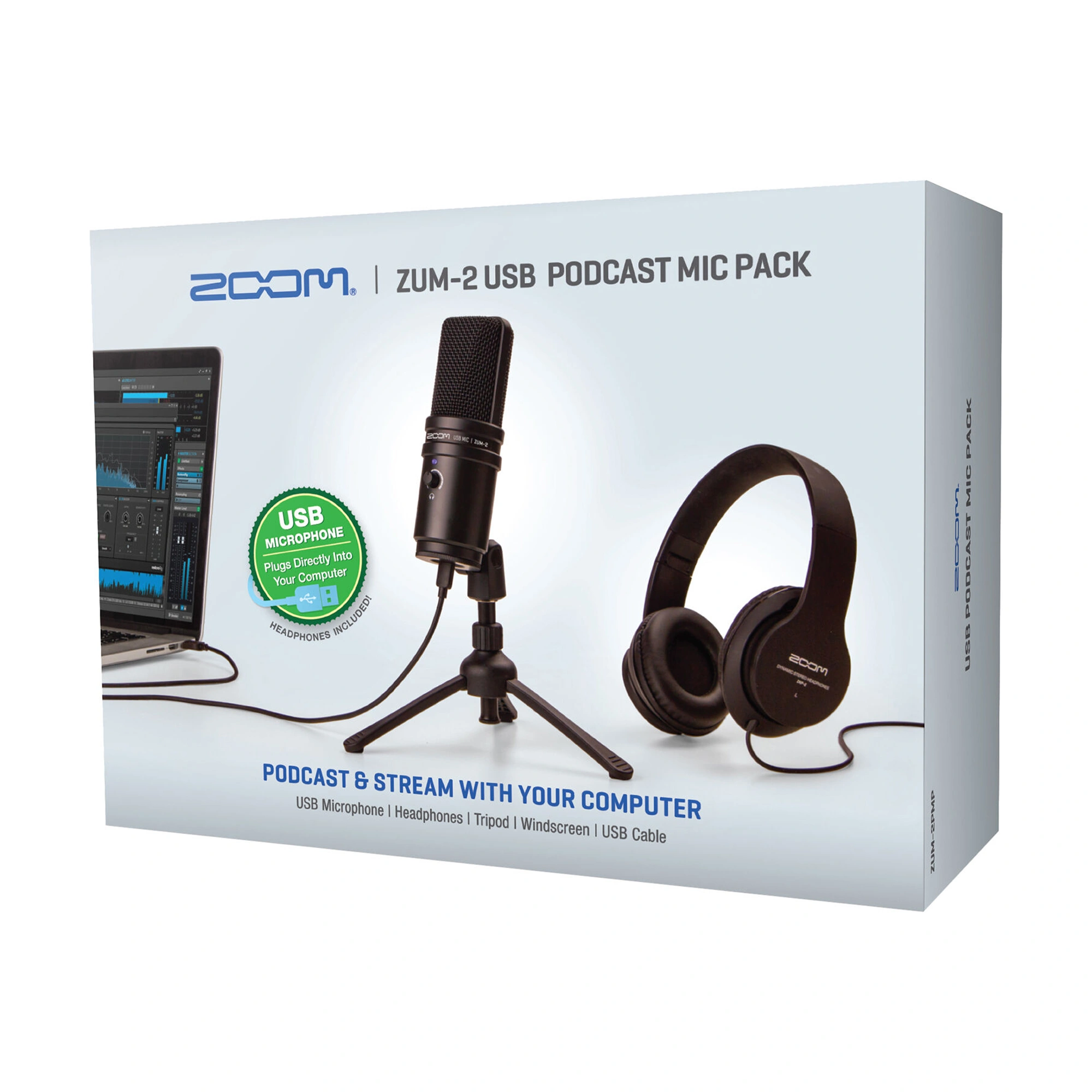 The Zum-2 PMP set includes a USB microphone, professional closed-back headphones, an adjustable microphone stand, a windscreen, and a two-meter USB cable. All you need is your computer.